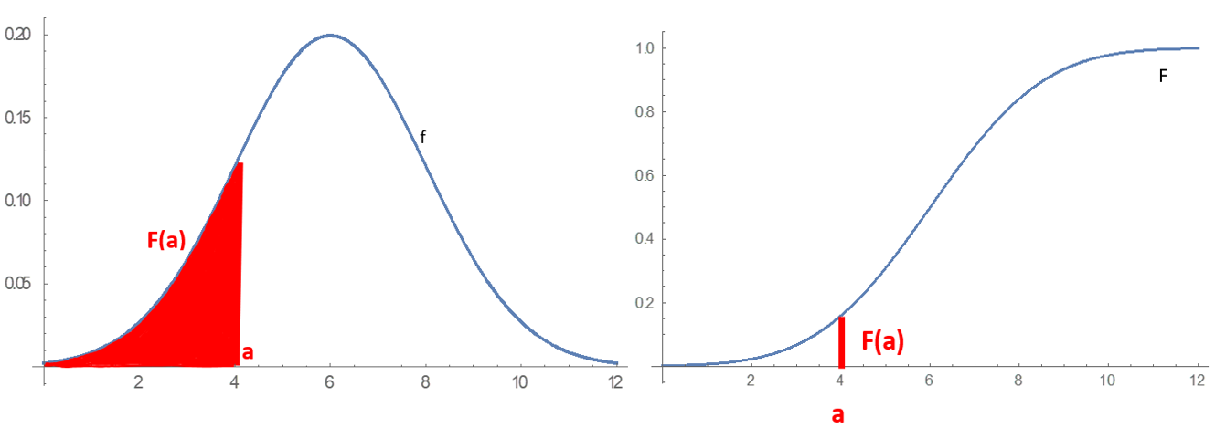 절대 연속 확률 분포는 확률 밀도 함수로 설명할 수 있다. 주어진 간격에 결과가 있을 확률은 해당 간격에 대한 확률 밀도 함수를 적분하여 계산할 수 있다.[7] 또는 누적 분포 함수를 사용할 수 있다. 이는 확률 변수가 주어진 값보다 크지 않을 확률을 설명한다. 누적 분포 함수는 확률 밀도 함수 아래의 면적이다.[4]
