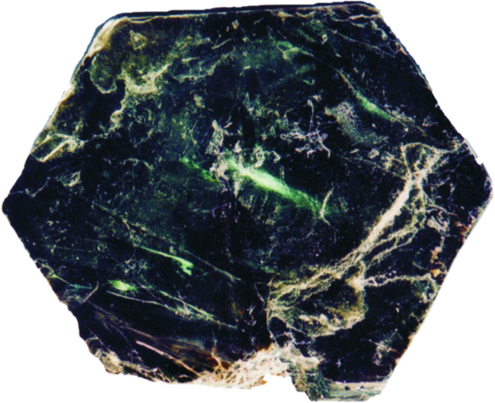 흑운모는 박편에서 중간 정도의 부조와 연한 갈색에서 짙은 녹갈색 또는 갈색을 띠며, 중간에서 강한 다색성을 나타낸다. 흑운모는 높은 복굴절률을 가지고 있지만, 고유의 진한 색상으로 인해 부분적으로 가려질 수 있다.[11] 직교 니콜 하에서 흑운모는 쪼개짐면에 거의 평행하게 소광되며, 박편 연마 과정에서 광물의 유연한 박판이 왜곡되어 생기는 특징적인 새눈무늬 소광(bird's eye maple extinction), 즉 얼룩덜룩한 모양을 보일 수 있다. 박편에서 흑운모의 저면 단면은 일반적으로 약 육각형 모양이며, 직교 니콜 하에서 대개 등방성으로 나타난다.[12]2. 2. 구조