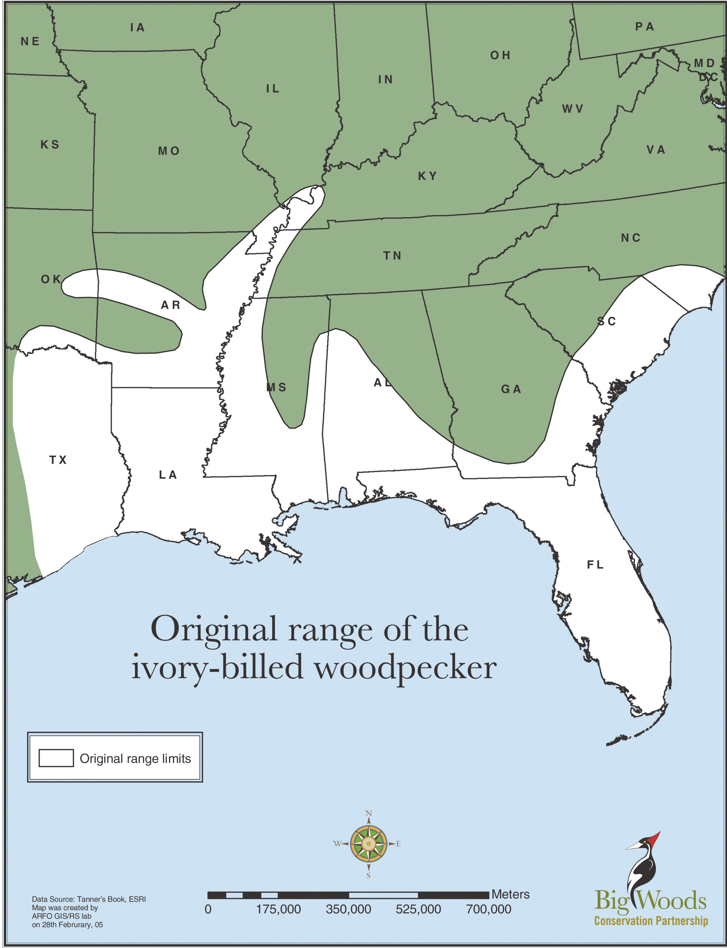 흰부리딱따구리의 서식지를 포괄적으로 추정하려는 시도는 서식지가 삼림 벌채와 사냥으로 인해 심각하게 감소한 이후에야 이루어졌다. 이 종에 대한 최초의 서식지 지도는 1891년 에드윈 M. 해즈브룩(Edwin M. Hasbrouck)에 의해 제작되었고,[27] 두 번째 서식지 지도는 1942년 제임스 태너(James Tanner)에 의해 만들어졌다.[28] 두 연구자 모두 신뢰할 수 있는 역사적 기록과 표본 데이터를 바탕으로 종의 원래 서식지를 재구성했다. 그 결과, 삼림 벌채와 사냥이 서식지를 줄이기 시작하기 전에 흰부리딱따구리가 동부 텍사스에서 노스캐롤라이나까지, 남부 일리노이에서 플로리다와 쿠바까지 분포했으며,[29] 일반적으로 해안에서 내륙으로 해발고도 약 30m인 곳까지 서식했다는 유사한 결론에 도달했다.[30]
