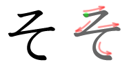 현대 일본어에서 'そ'는 한 가지 형태(--|]]|]])로 통일되었지만, 과거에는 위쪽 획이 분리된 형태(--|]]|]])와 이어진 형태 두 가지가 있었다. 이는 "曽"의 윗부분을 생략하며 생긴 차이로, 필기 습관 차이로 여겨진다.[1] 과거 학교 교육에서는 분리된 형태를 사용했지만 현재는 이어진 형태가 주류이다.[1]
