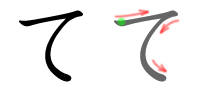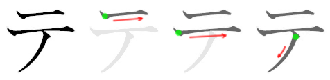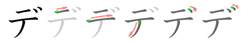 히라가나 て일본어와 가타카나 テ일본어는 모두 한 획으로 쓴다. 탁음 で일본어, デ일본어는 획순은 동일하며, 탁점을 추가한다.