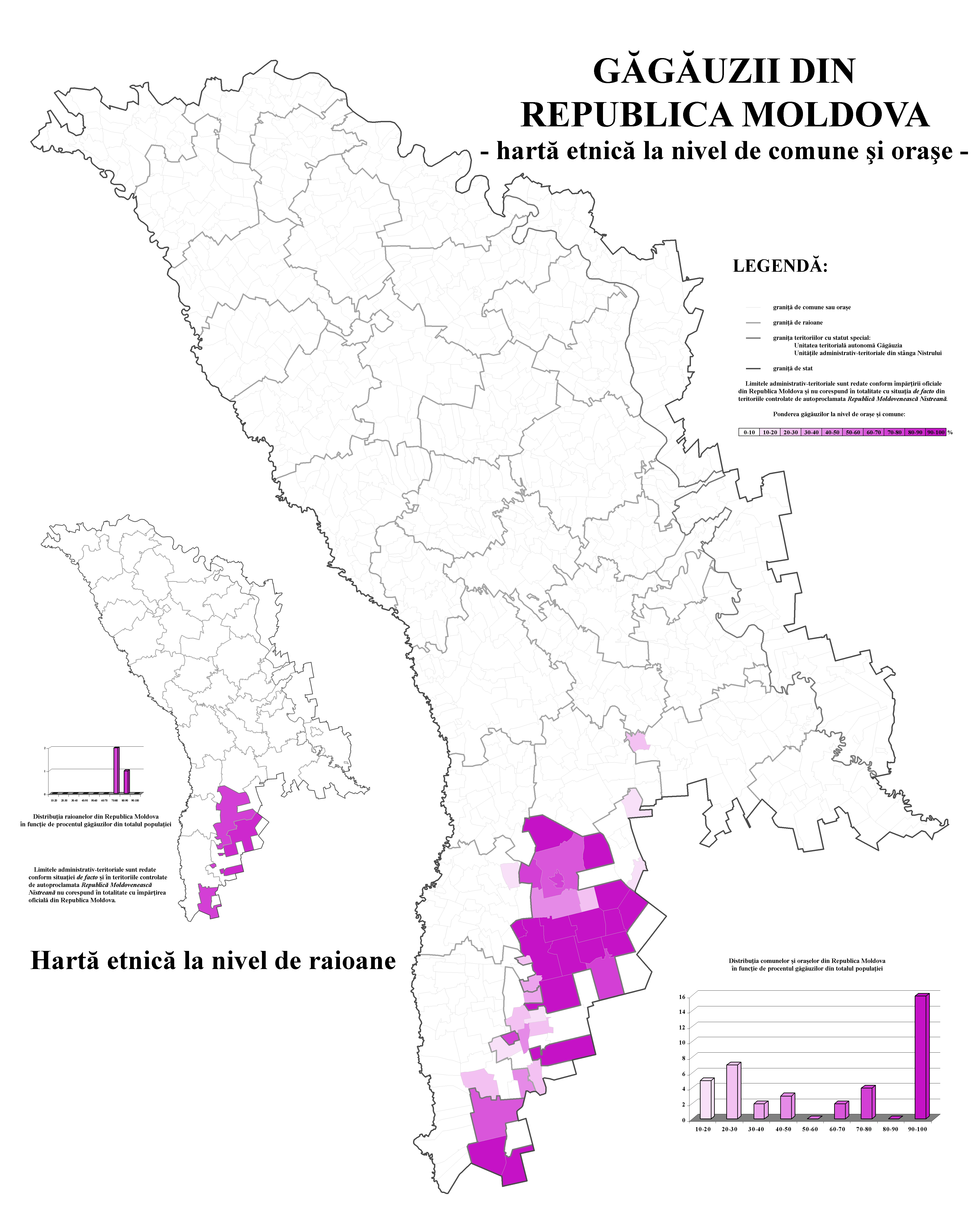 가가우즈인은 주로 몰도바 남부 (가가우지아)에 집중 거주하며, 몰도바 전체 인구의 약 4.5%를 차지한다. 몰도바에서 세 번째로 큰 소수 민족이며, 주로 농촌 지역에 거주한다.[21] 19세기 초 러시아가 남부 베사라비아(부자크)를 식민지화하는 동안, 가가우즈인들은 발칸 반도 동부에서 이주하여 몰도바 공화국의 미래 영토에 정착하기 시작했다. 가가우즈인들은 몰도바 전역에 고르게 분포되어 있지 않으며, 특히 가가우지아를 포함한 국가 남부에 주로 거주한다.[20]