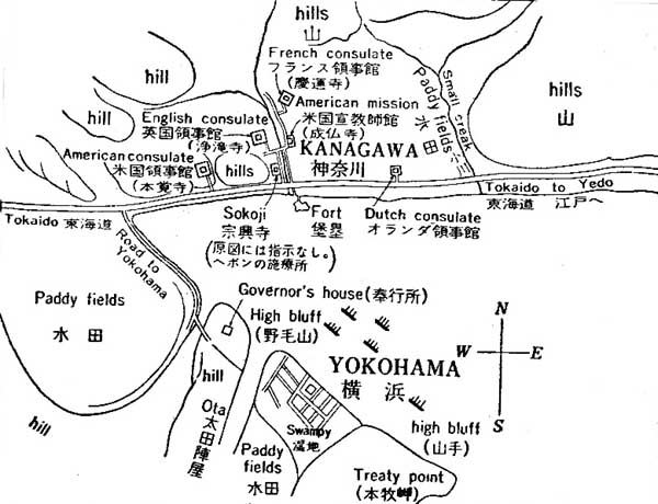 안세이 5년(1858년), 가나가와 항 앞바다 · 코시바 (요코하마 핫케이 섬 주변)에 정박했던 포우하탄 호에서 미일수호통상조약이 체결되었다. 이 조약에서는 "가나가와"를 개항한다고 규정했다. 그러나 가도를 통행하는 일본인과 입항하는 외국인 사이의 분쟁을 피하기 위해 가나가와 항의 반대편에 있는 요코하마 촌에 항만 시설과 거류지를 만들어 개항했다. 이것이 현재의 요코하마 항이 되었다. 그 때문에 외국인에게는 요코하마가 가나가와의 일부라고 칭했다.