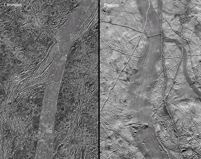 고랑 지형은 밝은 지역에서 주로 나타나며, 지각 변동에 의해 형성된 것으로 보인다. 가니메데 표면의 긴 줄무늬는 행성 과학에서 아직 풀리지 않은 문제 중 하나이다. 얼음화산 활동은 미미한 역할만 했을 것으로 추정되며,[169] 조석 가열과 불안정한 궤도 공명이 주요 원인으로 생각된다.[169][183]
