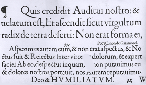 가라몬의 디자인은 베네치아의 인쇄업자 알두스 마누티우스를 위해 프란체스코 그리포가 1495년경에 조각한 글꼴을 기반으로 했다.[18] 이 활자는 피에트로 벰보의 ''De Aetna''에 처음 사용되었으며, 이후 16세기 프랑스 활자 주조공들은 마누티우스의 작품을 연구했다.