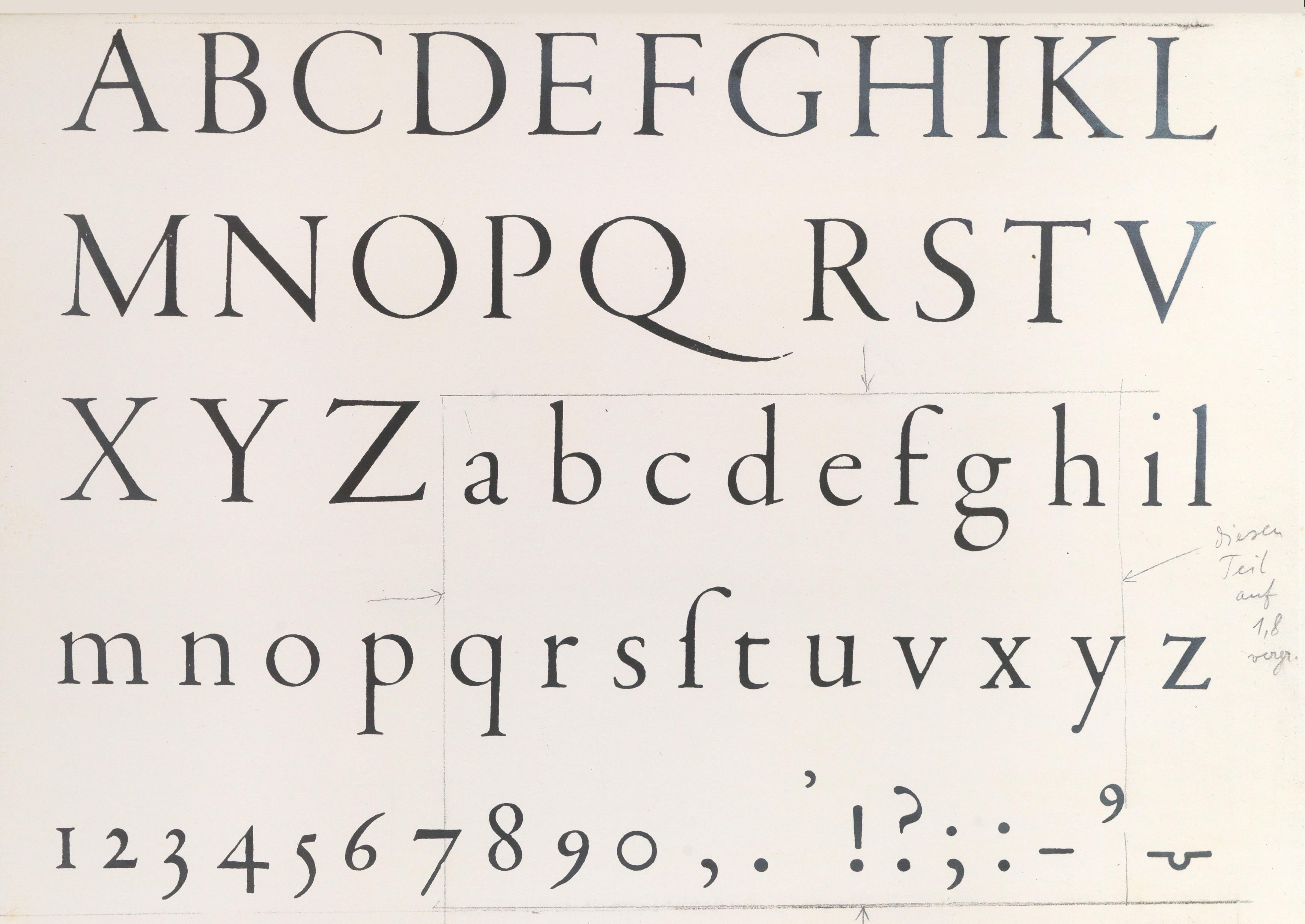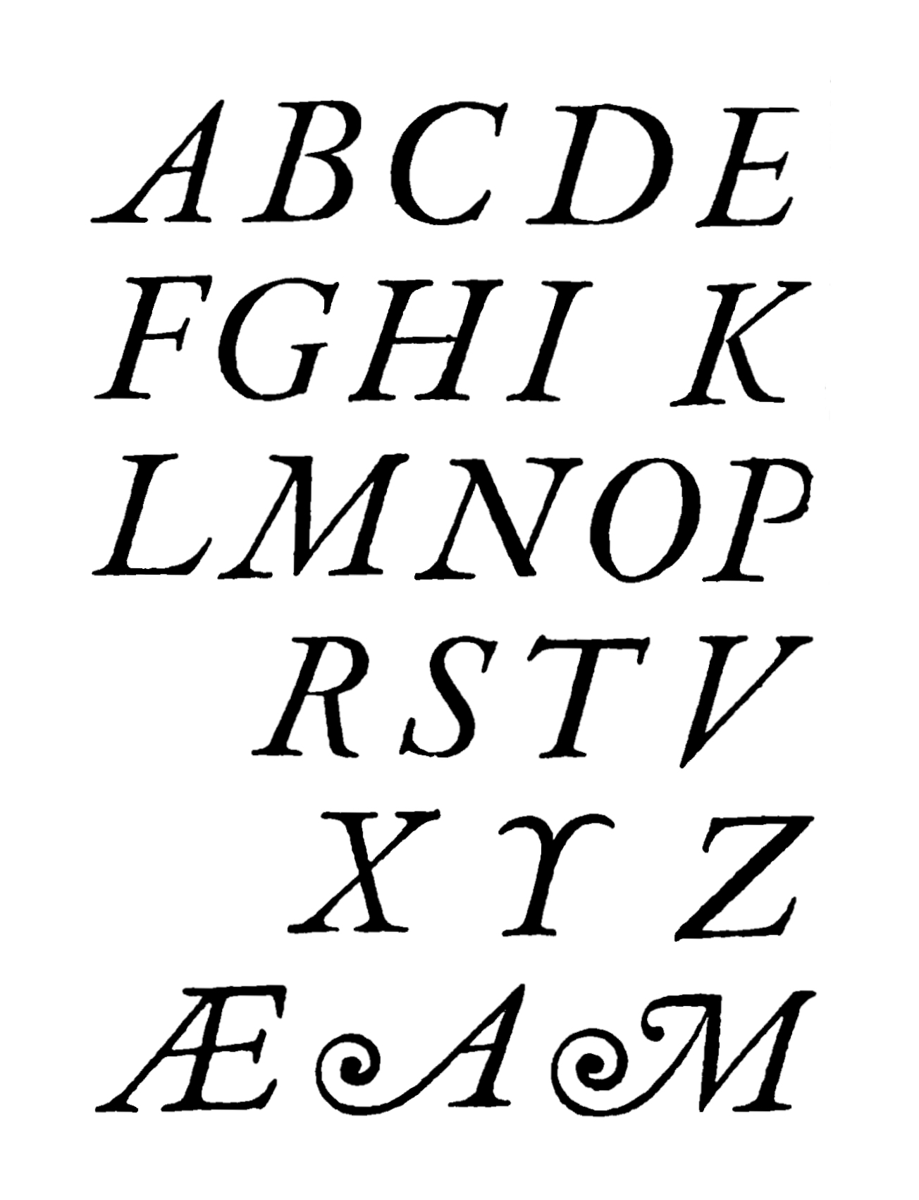 가라몽과 동시대인들의 구식 글꼴은 18세기 말까지 유럽 활자 제작소에서 사용되었다. 안드레아스 베켈의 책(1555년)에서 'W'가 드물게 등장하기도 했다. (왼쪽 이미지)