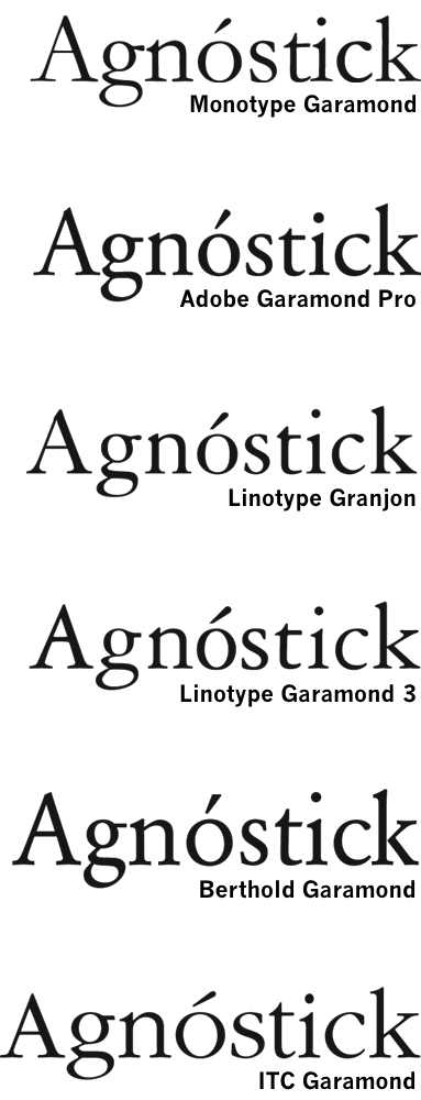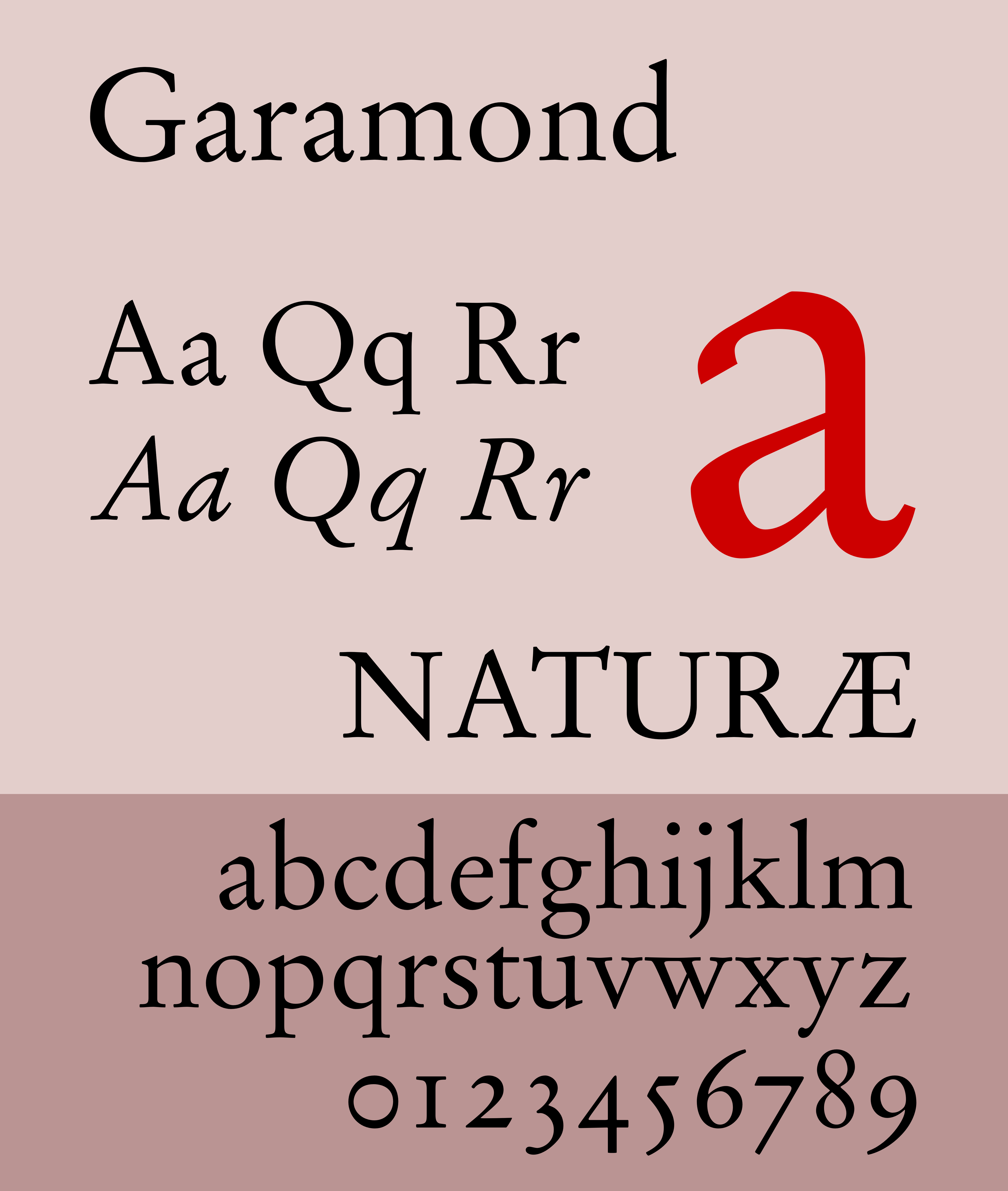 - 모노타입 가라몬드 (Monotype Garamond): 1922-1923년 모노타입에서 디자인한 서체로, 국립 인쇄소에서 자농의 작품을 기반으로 하며, 마이크로소프트 오피스에 번들로 제공된다.[196][152] 자농의 작품에 충실한 이탤릭체는 매우 서예적이며, 기울기 각도가 가변적이고 여러 소문자에 장식이 있다.[153]