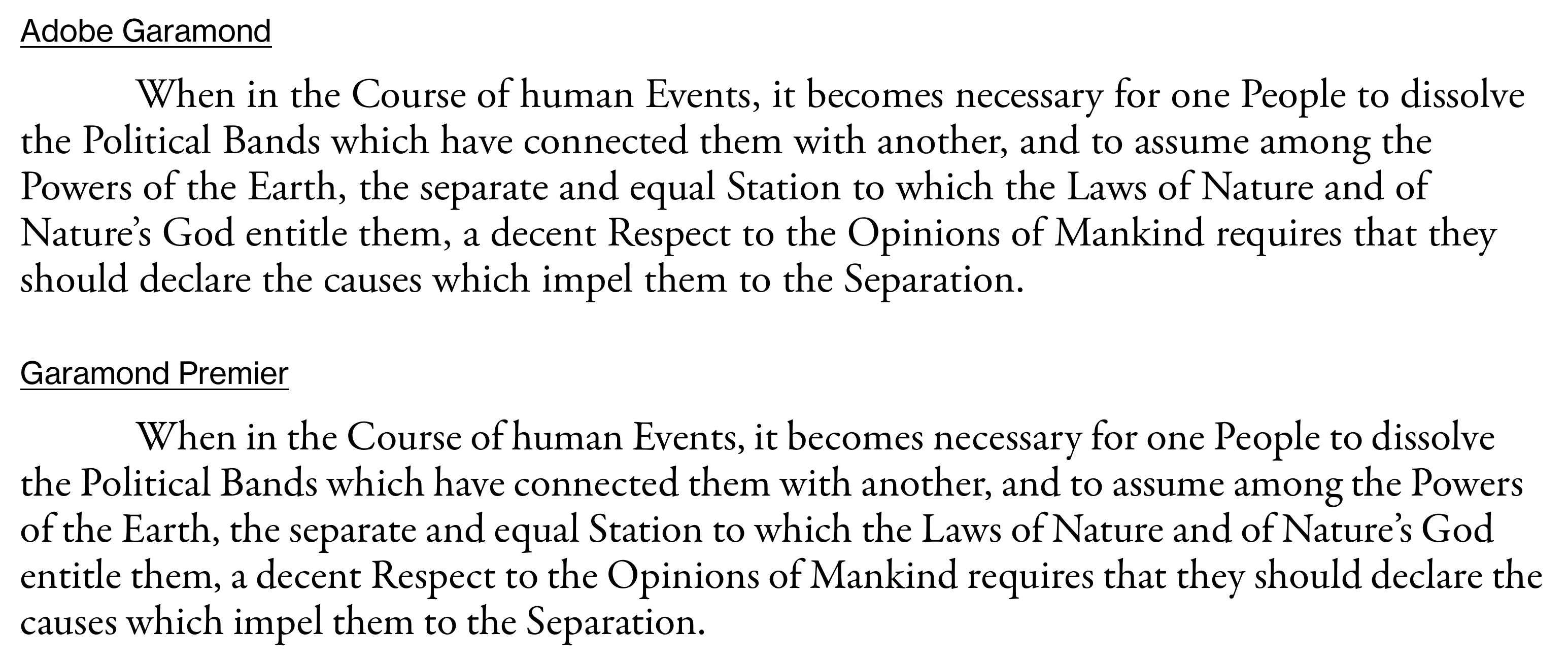 어도비 가라몽 프로(Adobe Garamond Pro) | 어도비 | 로버트 슬림백 | 가라몽 | 1989년 출시. 가라몽 로만체와 그랑장 이탤릭체 기반. |