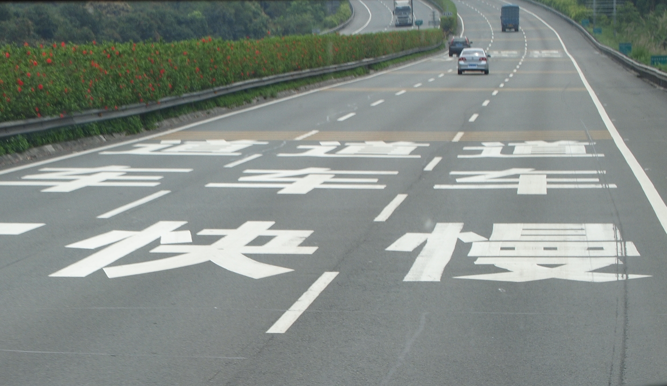 고속도로 표지판은 아래에서 위로 읽는다. 오른쪽 차선에는 '서행차로'가, 가운데 차선에는 '추월차로'가 쓰여 있다.