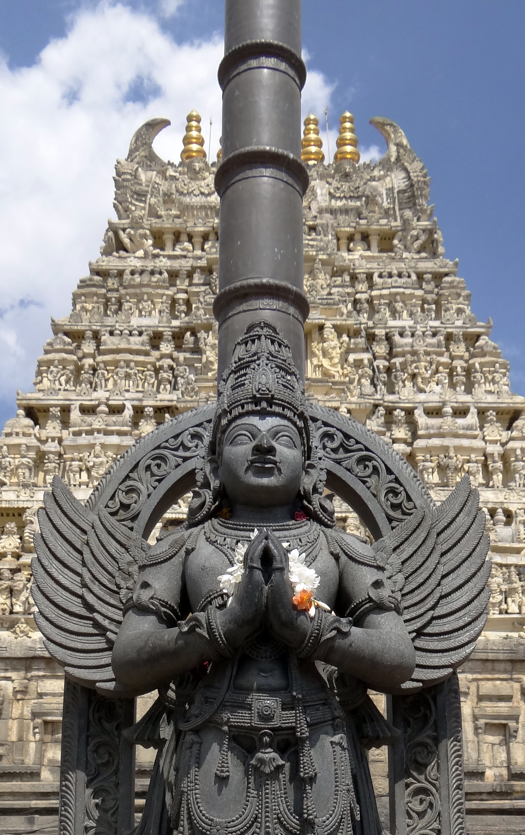 힌두교에서 गरुड|가루다sa는 신성한 독수리 같은 태양 조류이자 새들의 왕이다.[12] ''리가베다''에는 날개를 가진 천상의 데바로 묘사되는 ''가루트만''이 언급되어 있다.[14][13] ''야주르베다'' 경전에 포함된 ''사타파타 브라흐마나''는 가루다를 용기의 의인화로 언급한다. ''마하바라타''에서는 가루트만이 가루다와 동일하며, 빠르고 어떤 형태로든 변신하여 어디든 들어갈 수 있다고 묘사되어 있다.[14] 그는 서사시에서 강력한 존재로 묘사되는데, 그의 날갯짓은 천국, 지구, 지옥의 회전을 멈출 수 있다고 한다. 그는 힌두교 신 비슈누의 탈것으로 묘사되며, 일반적으로 함께 나타난다.[14] 그는 태양신 수르야의 마부인 아루나의 동생이다.조지 윌리엄스에 따르면, 가루다는 동사 ''gri'' 또는 말하다에서 유래했다.[13] 그는 베다 문헌에서 ''릭''(율동), ''사만''(소리), ''야즈냐''(희생 제물), 그리고 ''아트만''(자아, 의식의 가장 깊은 수준)에 대한 은유이다. 윌리엄스는 푸라나에서 가루다가 그 개념의 문자 그대로의 구현체가 되며, 최고 자아(비슈누)와 연결되고 분리할 수 없는 자아가 된다고 말한다.[13][15] 가루다는 바이슈나바교의 필수적인 부분이지만, ''가루다 탄트라''와 ''키라나 탄트라''와 같은 샤이바교 경전과 시바 사원에서 새와 ''아트만''의 은유로 두드러지게 등장한다.[15][16][17]