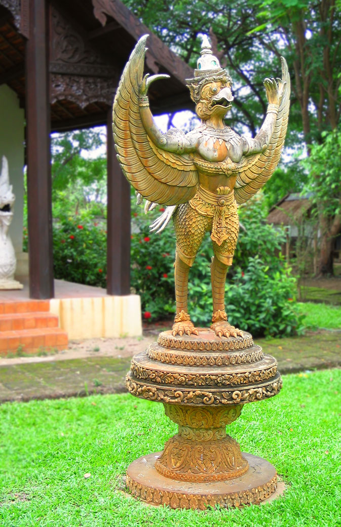 가루다는 힌두교와 불교 신화에 등장하는 신성한 존재로, 독수리 또는 새의 모습을 하고 있다. 힌두교에서는 비슈누의 탈것으로 묘사되며, 용맹함과 권위를 상징한다. 불교에서는 나가(Naga)의 적으로 묘사되며, 부처의 설법을 듣는 모습으로 묘사되기도 한다. 가루다는 동남아시아 여러 국가에서 국가 상징으로 사용되며, 태국과 인도네시아의 국장에 등장한다. 또한, 몽골, 일본 등 다양한 문화권에서 상징적인 의미를 지니며, 조형물, 문학, 예술 등 다양한 형태로 나타난다.