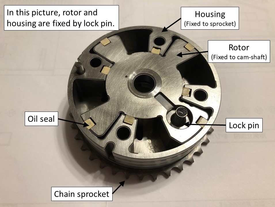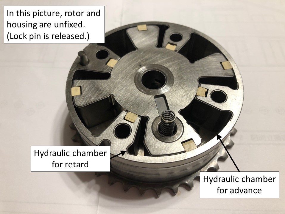 베인식 유압 VVT의 내부 구조. 록킹 핀 체결에 의해 하우징과 베인이 고정된 상태.