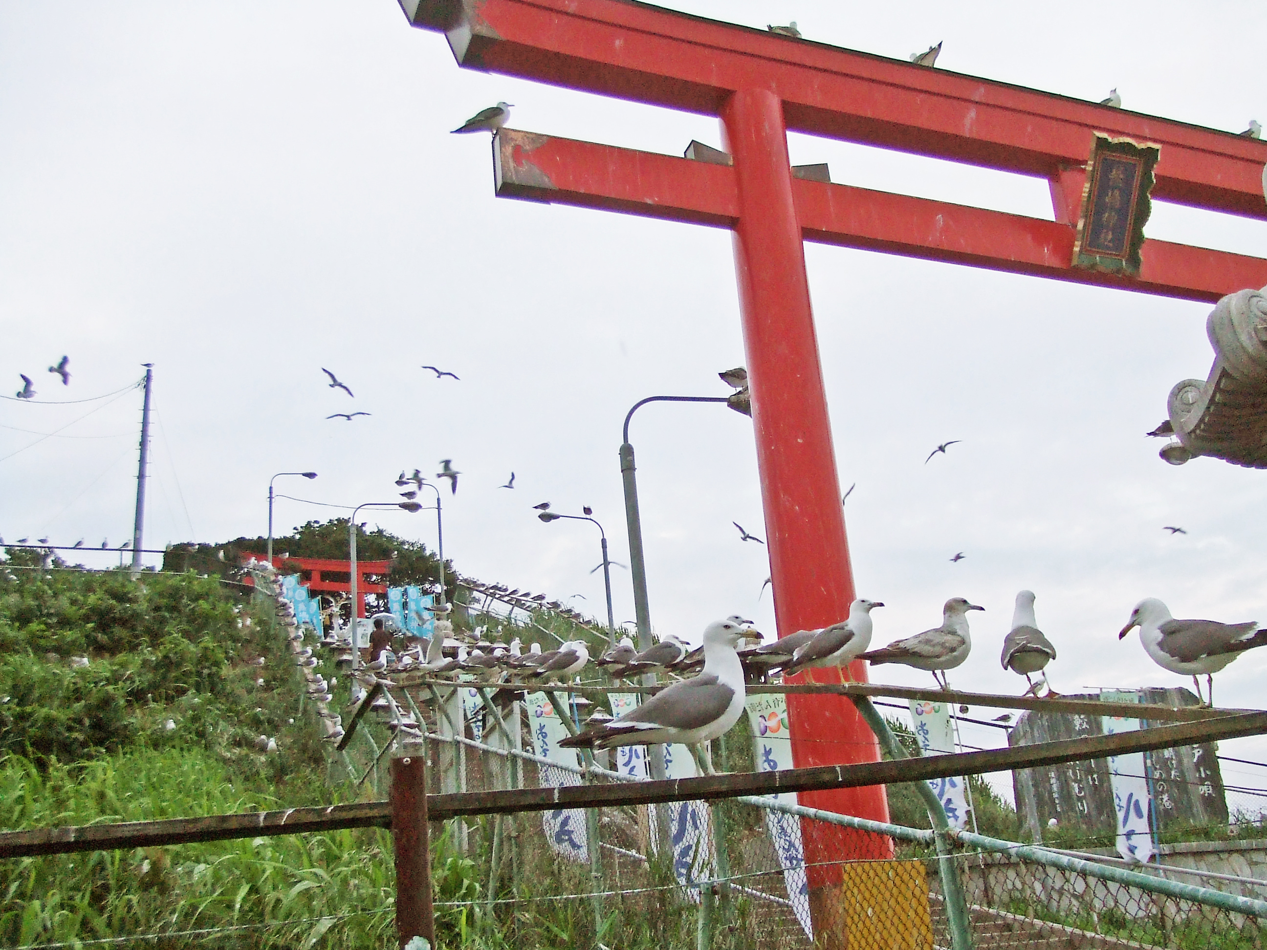 번식기에는 약 3만 마리의 괭이갈매기가 떼를 지어 날아다니므로, 신사 경내에도 발 디딜 틈이 없을 정도이다. 운이 나쁘면, 하늘에서 괭이갈매기의 배설물(분뇨)을 뒤집어쓰게 된다. 산기슭에는 무료로 빌려주는 비닐 우산이 몇 개 설치되어 있지만, 대부분 훼손되어 있다.4. 하치노헤 소우타