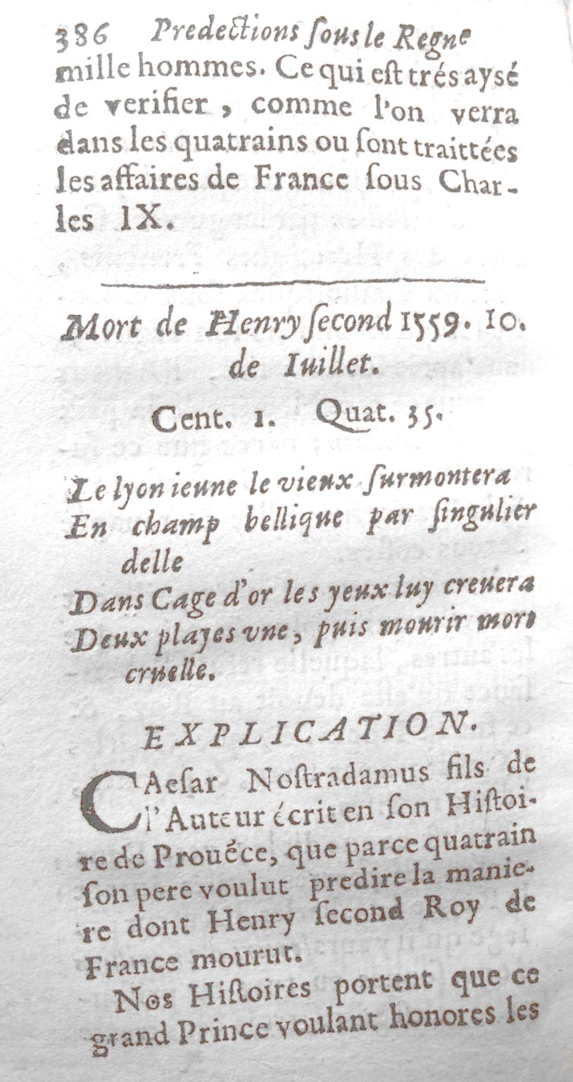 예언 신봉자들은 이 시의 '젊은 사자'를 몽고메리 백작으로, '늙은 자'를 앙리 2세로 해석한다. 하지만 이러한 해석에는 여러 문제점이 지적된다. 첫째, 당시 몽고메리 백작은 29세에서 33세 사이였고, 앙리 2세는 40세였다. '젊은'과 '늙은'이라는 표현으로 둘을 대비시키는 것은 다소 어색하다. 둘째, 몽고메리 백작과 사자를 연결할 만한 고리는 그의 출신지인 스코틀랜드 왕국이 사자 문장을 사용한다는 점 정도인데, 그는 프랑스 왕국의 귀족이자 군인으로 활동했다. 셋째, 앙리 2세가 착용한 투구는 금으로 만들어지지 않았으며, 사고 당시 꿰뚫린 것은 한쪽 눈뿐이었다. 넷째, 마지막 행의 '함대'는 마상 창 시합과 아무런 관련이 없다.