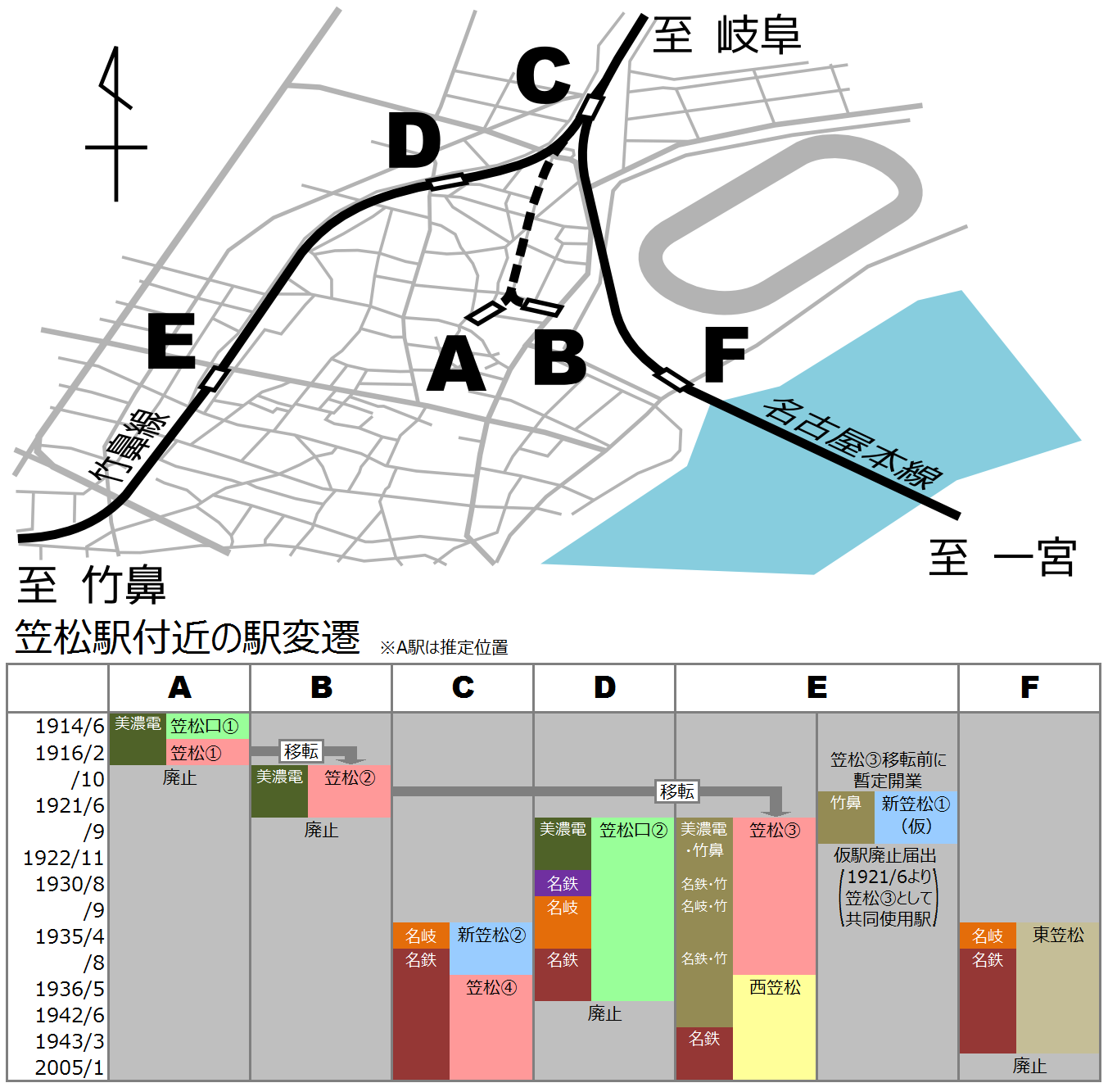 1935년 4월 29일 | 메이테츠 메이기선 개통에 따라, 가사마쓰선(후의 다케하나선)과의 접속 장소에 신가사마쓰역(2대) 개업(도중 C역).[3] |