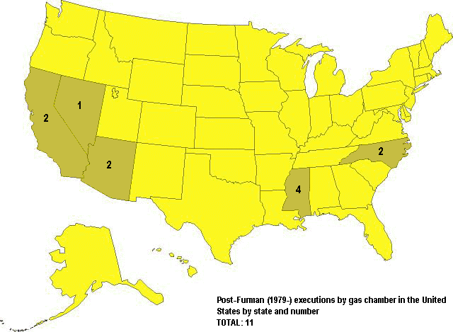 1976년 미국에서 사형 제도가 부활한 이후, 가스실을 이용한 사형은 11건이 집행되었다. 주 별로는 미시시피 4건, 애리조나 2건, 캘리포니아 2건, 노스캐롤라이나 2건, 네바다 1건이다. 사형 제도 부활 이후 가스실을 이용한 최초의 사형은 1979년 네바다에서 제시 비숍이 살인 혐의로 처형된 것이었다. 가스실을 이용한 가장 최근의 사형은 1999년에 집행되었다.[35] 1980년대에 들어서면서, 가스실 사형 중 고통에 대한 보고가 이 방법의 사용에 대한 논란을 불러일으켰다.[36]