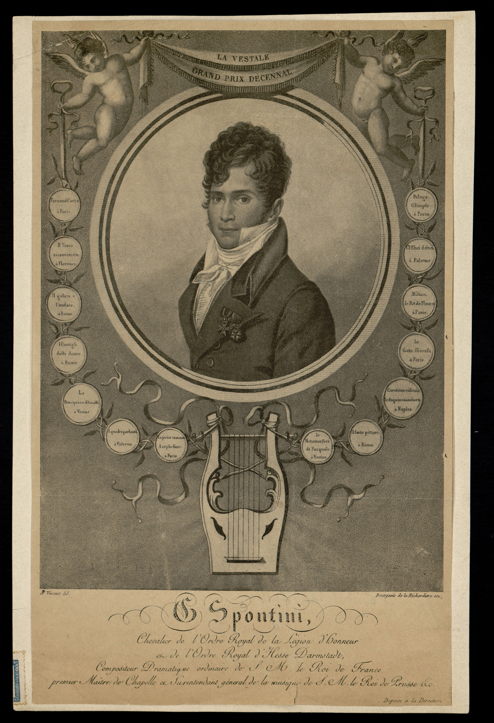 스폰티니는 글루크의 고전적인 서정 비극의 이념을 멜로드라마와 더 웅대한 광경이나 풍부한 오케스트라 음색 및 특징적인 언어 표현에 결합된 독창적인 선율로서 당시 취향에 어울리도록 노력했다.[7] 나폴리 음악원에서 공부한 후 1803년 파리로 이동하여, 1805년에는 궁정 작곡가가 되었다. 1807년에는 조제핀 황후의 장려로 그의 가장 유명한 작품인 베스타의 여사제를 썼다. 파리 오페라에서의 초연은 그를 당대 가장 위대한 이탈리아 작곡가들 중 하나로 만들었다. 케루비니와 마이어베어는 그의 작품을 대표작으로 인정했으며, 베를리오즈와 바그너같은 후대의 작곡가들은 그것을 높이 평가했다.