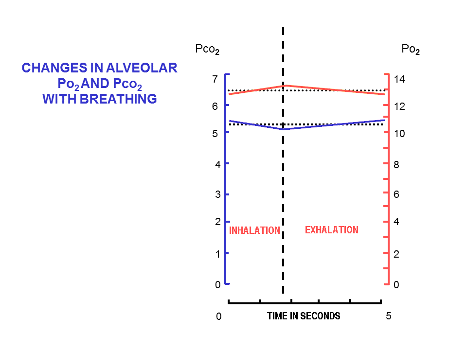 매 호흡 시 약간의 이산화탄소가 대기 중으로 배출되고 약간의 산소가 외부 공기로부터 흡수되어 3L의 폐포 공기 조성이 일정하게 유지된다. 짧은 기간의 과호흡으로 평소보다 많은 이산화탄소가 손실되면, 폐포 가 5.3 kPa (40 mmHg)로 돌아올 때까지 호흡이 느려지거나 중단된다. 동맥혈 내 이산화탄소의 총 농도는 약 26 mM (또는 100ml당 58 ml)이며,[19] 포화된 동맥혈 내 산소의 농도는 약 9 mM (또는 100ml당 20 ml)이다.[15] 이 높은 농도의 이산화탄소는 체외액의 pH를 결정하고 유지하는 데 중요한 역할을 한다. 따라서 각 호흡 시 내뱉는 이산화탄소는 신체의 체외액 이산화탄소 및 pH 항상성의 부산물로 간주하는 것이 더 정확할 수 있다.
