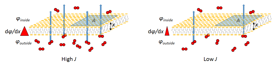 일반적으로 기체 교환 표면을 가로지르는 농도 기울기가 높을수록, 그리고 기체 교환 표면이 얇을수록(동일한 농도 차이에서) 기체는 더 빠르게 확산된다.[4] 단위 면적당 유량(''J'')은 면적을 증가시켜도 변하지 않지만, 사용 가능한 표면적을 증가시키면 주어진 시간에 확산될 수 있는 기체의 ''양''이 증가한다.[4] 이는 단위 시간당 확산되는 기체량(d''q''/d''t'')이 ''J''와 기체 교환 표면의 면적(''A'')의 곱이기 때문이다.