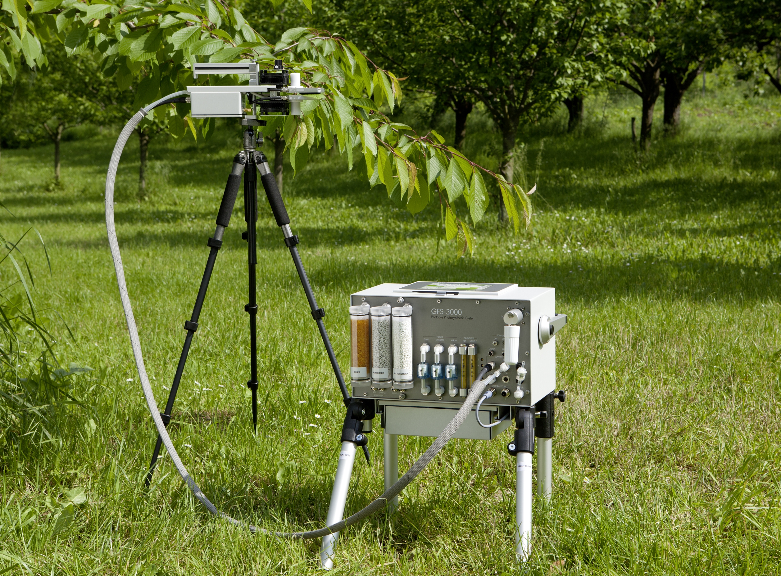 가스 교환 측정은 식물 과학에서 중요한 도구이다. 여기에는 일반적으로 식물 (또는 식물의 일부)을 챔버에 밀봉하고 적외선 가스 분석기로 이산화 탄소 및 수증기 농도의 변화를 측정하는 것이 포함된다. 환경 조건 (습도, 이산화탄소 농도, 빛 및 온도)이 완전히 제어되면 이산화탄소 흡수 및 물 방출 측정을 통해 이산화탄소 동화 및 증산 작용 속도에 대한 중요한 정보를 얻을 수 있다. 세포간 이산화탄소 농도는 식물의 광합성 상태에 대한 중요한 정보를 제공한다.[40][41] 특정 상황에서는 더 간단한 방법을 사용할 수 있다. 탄산 수소염 지시약은 다른 수준의 광도에서 단일 식물 잎이 포함된 용액에서 이산화탄소 소비를 모니터링하는 데 사용할 수 있으며,[42] 검정말의 산소 발생은 작은 식물 조각이 들어 있는 잠긴 시험관에 가스를 단순히 수집하여 측정할 수 있다.