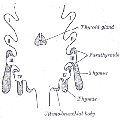 가슴샘을 구성하는 림프구와 상피는 서로 다른 발생 기원을 가진다.[8] 가슴샘의 상피가 먼저 발달하는데, 이는 세 번째 인두 주머니의 양쪽에서 하나씩, 총 두 개의 돌기 형태로 나타난다.[8] 경우에 따라 네 번째 인두 주머니도 발생에 관여하기도 한다.[5] 이 돌기들은 바깥쪽과 뒤쪽으로 자라나 주변의 중배엽과 신경 능선에서 유래한 간엽 조직 속으로, 복측 대동맥 앞까지 뻗어 나간다. 이 과정에서 림프구와 상피가 만나 결합 조직과 합쳐진다. 각 돌기가 시작된 인두 쪽의 구멍은 곧 막히지만, 연결 부위는 얼마 동안 세포 끈 형태로 남는다. 돌기를 덮고 있는 세포들이 증식하면서 세포 싹이 형성되고, 주변의 중배엽 조직에 둘러싸여 독립된 구조가 된다.[6]