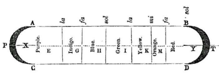 뉴턴은 스펙트럼을 빨간색, 주황색, 노란색, 녹색, 파란색, 남색, 보라색의 7가지 색상으로 구분했다.[12] 이는 고대 그리스 궤변가들의 영향으로 색상, 음표, 태양계의 알려진 물체, 요일 사이에 연결고리가 있다는 믿음에서 비롯된 것이다.[12]
