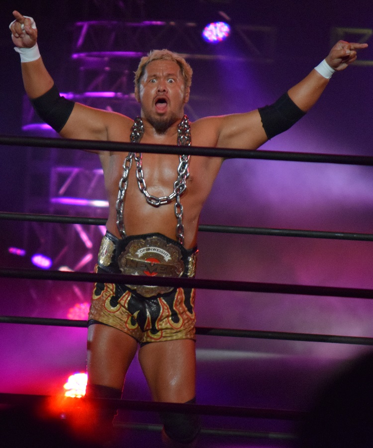 마카베 토기는 링 중앙에서 양손으로 가운데 손가락을 세우는 퍼포먼스를 했다.(2015년)