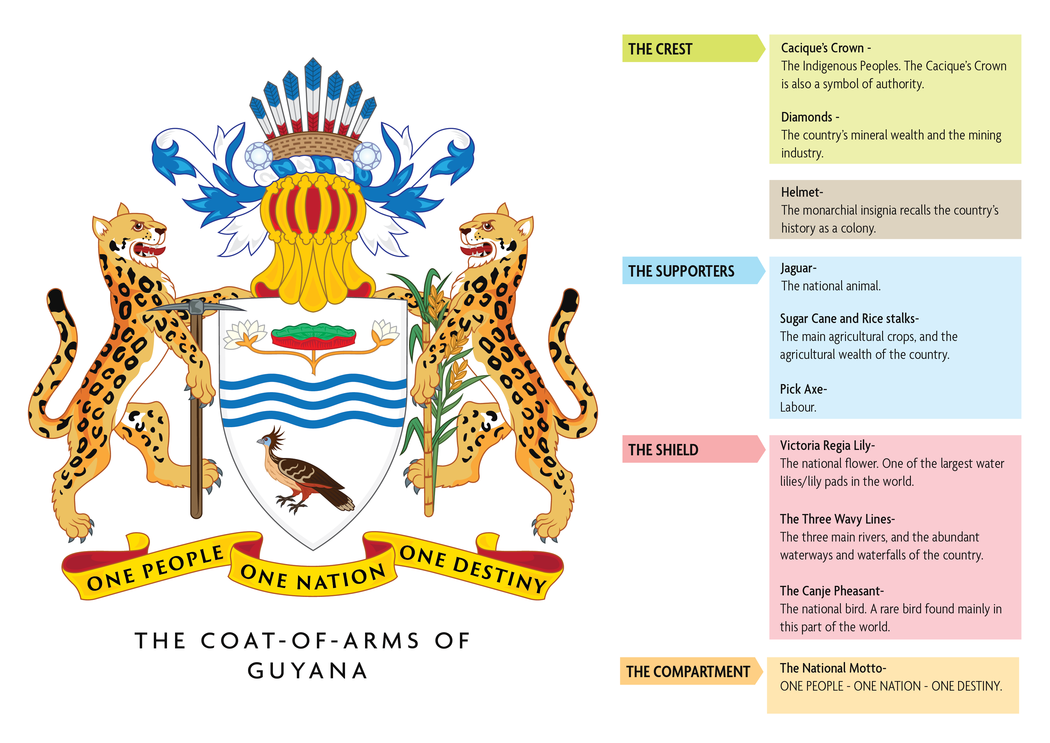 구성 요소 | 방패: 은색 바탕에 세 개의 물결치는 푸른색 가로 막대; 상단에는 가이아나의 국화인 빅토리아 레지아 수련; 하단에는 가이아나의 국조인 카이제꿩 (Opisthocomus hoazin) 방패 지지자: 곡괭이를 든 재규어와 벼와 사탕수수 줄기 |
