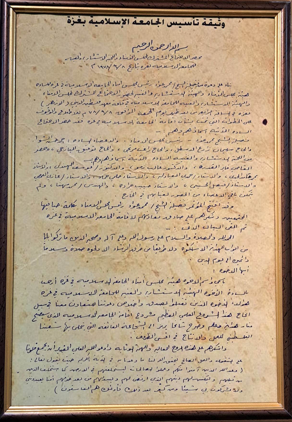 당시 아즈하리 학회의 가자 지부장이었던 셰이크 모하메드 아와드가 이슬람 대학교 설립 위원회를 이끌었다. 1978년 4월 12일, 위원회는 샤리아, 우술-딘, 아랍어 (나중에 문학부로 발전) 세 개의 학부 개설을 발표했다.[19] 이 대학교는 1978년 11월에 독립적이고 비영리적이며 남녀 분리 교육을 하는 대학교로 개교했으며, 가자 지구 최초의 고등 교육 기관이었다.[20]