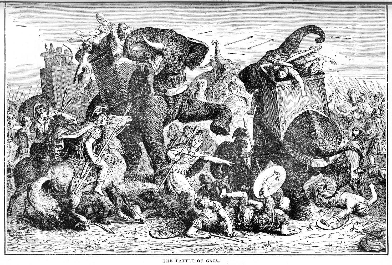 프톨레마이오스 군은 투사 무기를 집중적으로 퍼붓고 말뚝을 세워 방어해서 이를 막았다. 프톨레마이오스 군은 사슬이나 말뚝을 이용한 즉석 장애물로 전투코끼리의 발을 멈추게 하여, 보병이 코끼리와 기수를 공격하면서 전투코끼리 부대를 완전히 무력화시켰다. 전투코끼리 부대의 공격이 완전히 무산된 것을 보고 데메트리오스 군은 동요했고, 병사들의 사기는 떨어졌다.[15]