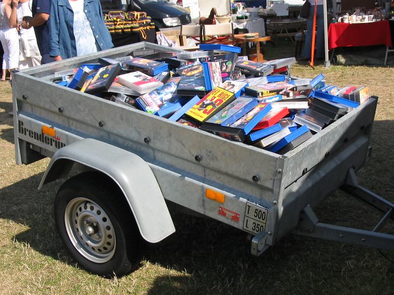 2000년대 중반까지, 가정용 비디오 구매자들은 비디오테이프에서 멀어져 갔고, 점점 더 DVD를 선호하게 되었다. 사진은 2004년 중고품 시장에서 판매되는 중고 비디오테이프 영화 카트이다.