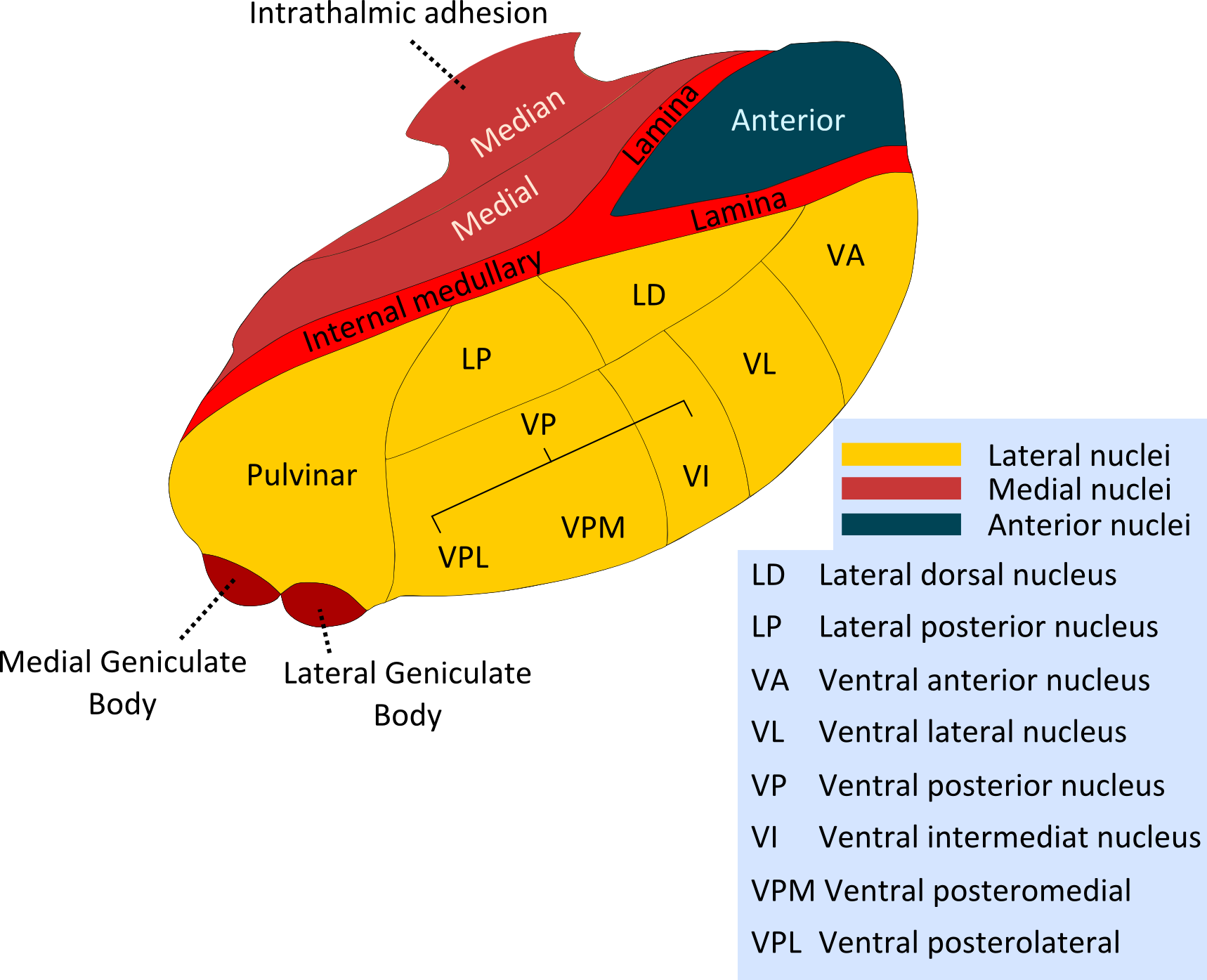 가쪽무릎핵은 M-세포층, P-세포층, K-세포층으로 구성되어 있으며, 이들은 각각 망막 신경절 세포의 종류에 따라 이름 붙여졌다.[37] 각 층은 같은 쪽 눈 또는 반대쪽 눈으로부터 정보를 받는다.[9]