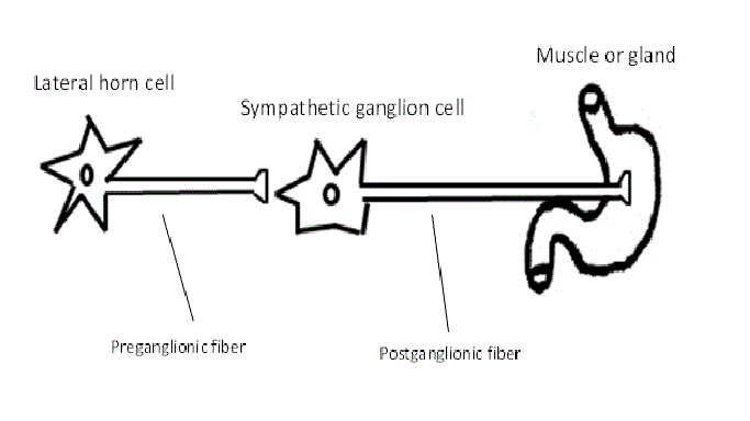 가쪽회색질기둥의 축삭은 시냅스에서 아세틸콜린을 분비한다. 이 신호는 시냅스 후 세포의 아세틸콜린 수용체 종류에 따라 세포를 흥분시키거나 억제할 수 있다. 신경절후 세포는 일반적으로 표적 기관에 노르에피네프린(노르아드레날린)을 분비하며, 이 시냅스 역시 흥분성 또는 억제성일 수 있다.[1]