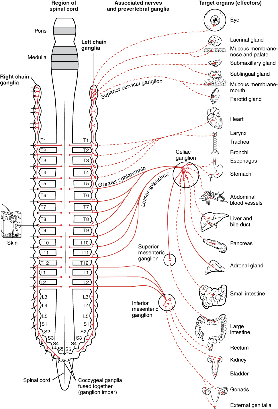 일부 가쪽회색질기둥 뉴런의 섬유는 교감 신경간 내에서 시냅스하지 않고 통과한다. 큰 내장 신경은 척수 T5-T9 높이에서 나와 복부의 복강 신경절에서 시냅스하며, 복강 동맥을 조절한다.[5] (내장 신경은 가슴과 복부 내장 기관을 조절하는 신경이다.)[2] 작은 내장 신경은 T10-T11 높이에서 나와 복부의 상장간막 신경절로 가서 상장간막 동맥과 대동맥신장 신경절을 조절한다.[5] 가장 작은 내장 신경은 T12 높이에서 신장 신경총과 연결된다.[11] 허리 윗부분 두 분절에서 나오는 허리 내장 신경은 복부의 하장간막 동맥과 관련된 하장간막 신경절에서 시냅스한다.[5] 또한, 일부 가슴 부위 내장 신경 섬유는 복부의 부신 수질을 직접 자극하여 스트레스 반응을 조절한다.[2]