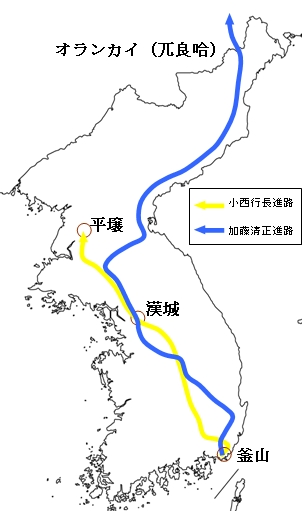 기요마사는 조선 국경인 두만강(豆満江)을 넘어 만주(満洲)의 오랑카이(길주(吉州) 이남에 주둔했다. 일본군이 떠난 함경북도에서는 조선인 의병이 봉기하여 길주를 공격했지만, 기요마사는 이를 격파했다.