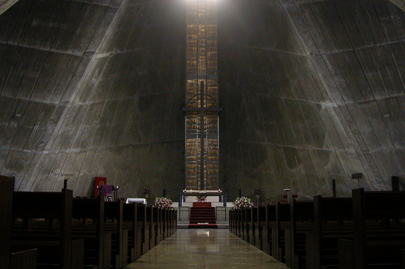 콘크리트로 쳐진 그대로의 내벽은 금욕적이고 정갈한 인상을 주며, 그 흔적은 근대 건축에 남겨진 약간의 수작업을 느끼게 한다. 가장 높은 곳에서 40m 가까이 이르는[21] 내부 공간은 전통적인 고딕 교회 건축의 상승 감각을 표상함과 동시에, 기독교의 전신인 구약의 고대 유대교회의 성막을 동시에 연상시키는 조형으로 되어 있다.[12]