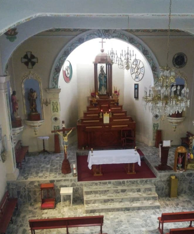 멕시코 오솔로테펙의 파브리카-마리아 마을 사원 제단 벽에 전시된 멕시코 가톨릭 액션의 문장. 20세기에는 지역 섬유 산업 노동자들이 이 운동을 열렬히 지지했다.