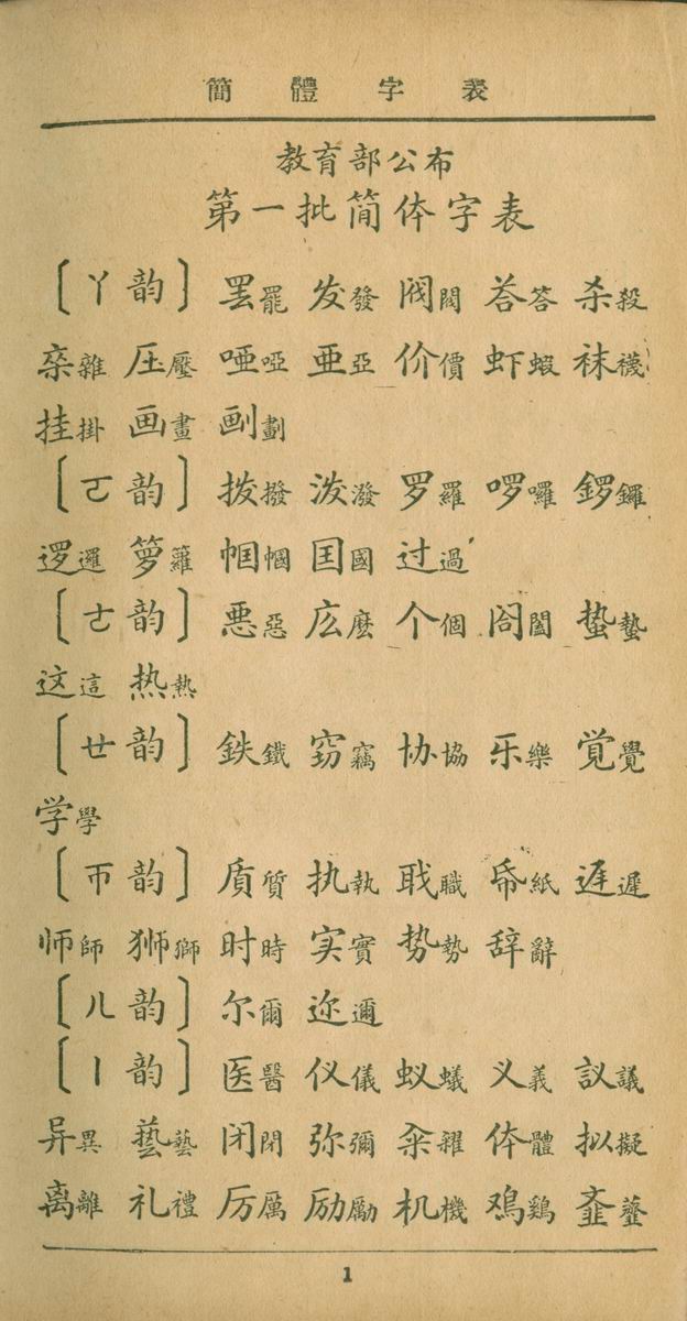 1935년 중화민국 교육부가 처음으로 공포했지만, 1936년에 철회된 간체자 목록 초안 발췌 (중화민국 시대)