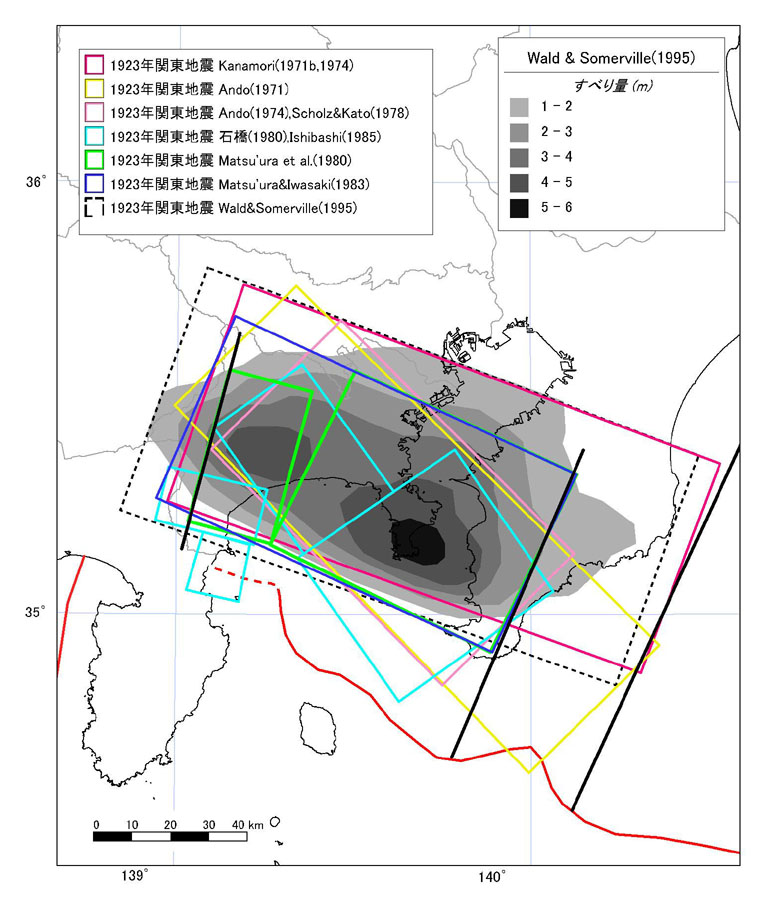 1923년 간토 대지진의 단층 모델은 여러 연구자들이 제시하였으며, 모두 우수향 저각 역단층을 주요 단층으로 보고 있다.[80] 그러나 관측 데이터 부족과 다중 진원으로 추정되어, 이 지진의 실상은 완전히 해명되지 않았다.[114]