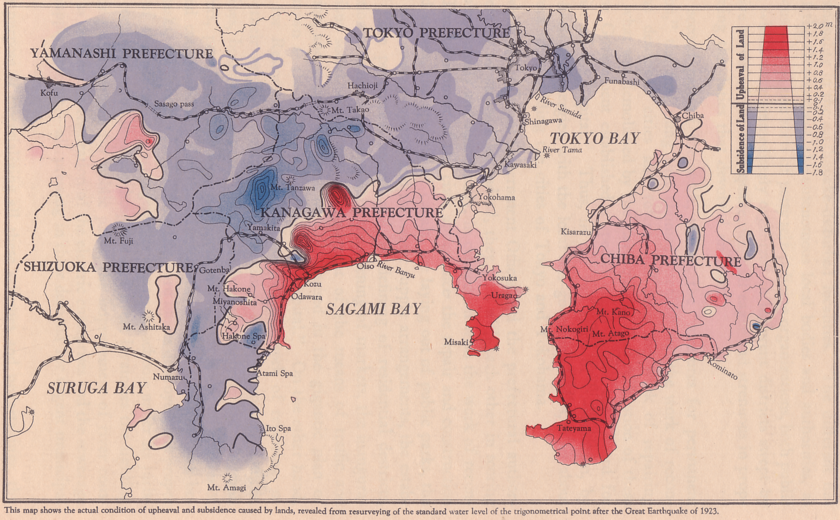 지각변동을 통한 추정으로는 진원단층이 쇼난 지역 내륙 안쪽까지 있다고 추정되며,[163] 지진의 진동은 오다와라 지역이 제일 심했다.[162] 도쿄도에서 진도6을 관측했으나 이 간토 대지진을 마지막으로 2000년 미야케섬 화산 분화로 인한 지진을 제외하고는 도쿄도에서 진도6 이상을 지진을 관측한 적이 없다.