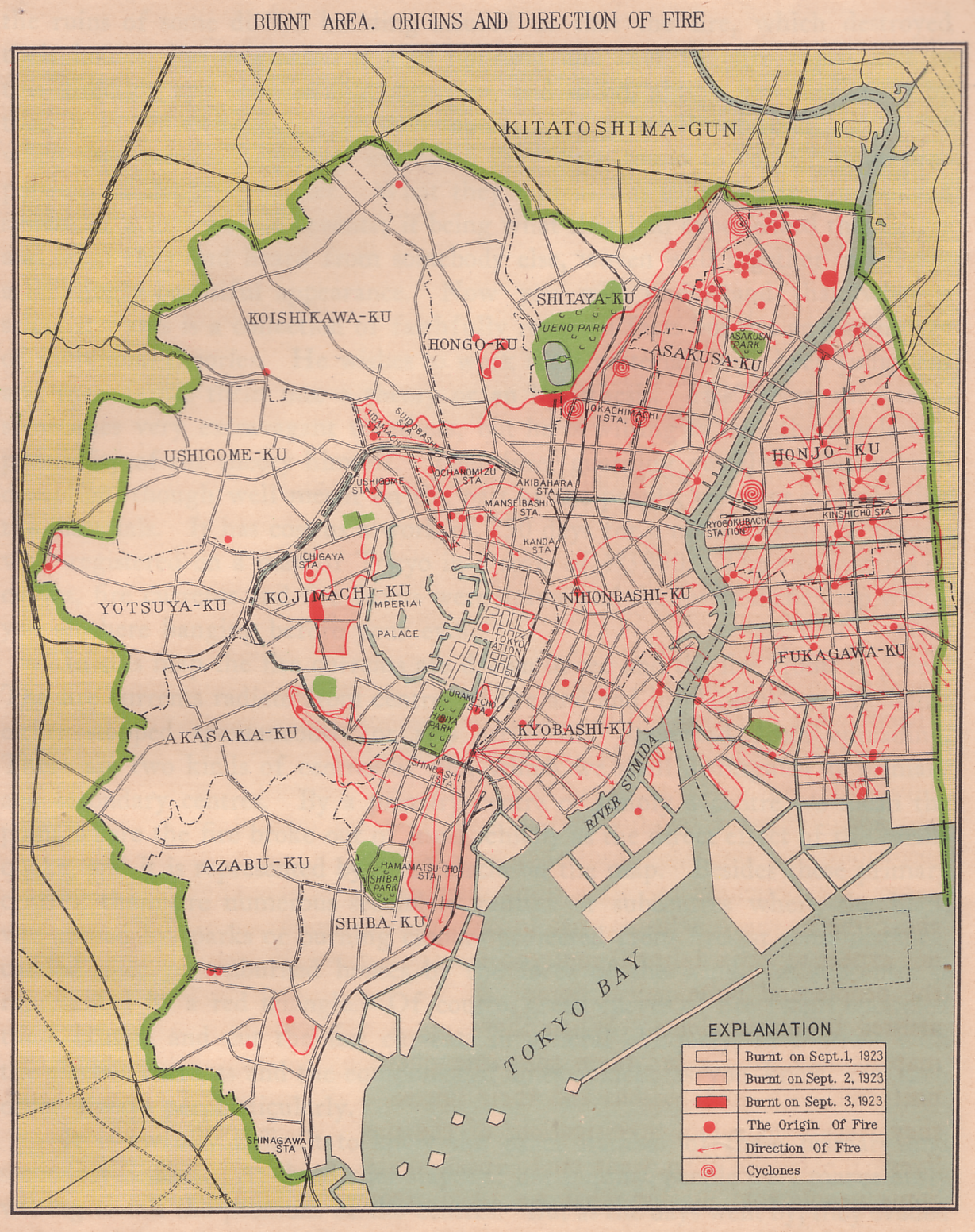 간토 대지진은 1923년 9월 1일 간토 지방 남부를 진원으로 발생한 대규모 지진이다. 지진으로 인해 도쿄와 가나가와 현을 중심으로 광범위한 지역에 걸쳐 막대한 인명 및 재산 피해가 발생했으며, 최대 10m 높이의 쓰나미와 화재가 잇따랐다. 지진 이후 일본 정부는 수도 이전 논의를 중단하고 도쿄를 재건했으나, 재건 과정에서 사회주의자, 아나키스트 등 반정부 인사와 재일 조선인에 대한 학살이 자행되는 비극적인 사건이 발생했다.