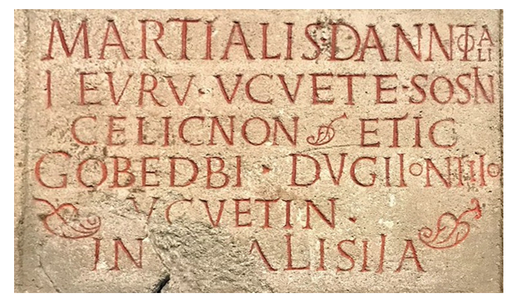기원전 3세기 마르세유 주변 지역에서 갈리아인이 그리스 문자로 쓴 갈리아식 인명이 확인되지만, 기원전 2세기에 갈리아어로 된 최초의 진정한 비문이 나타났다.[10]3. 2. 로마 시대 (기원전 58년 ~ 기원후 5세기)