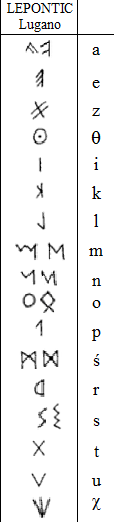 - 레폰티아어는 현대 스위스 루가노 근처 알프스 남쪽 사면의 작은 지역에서 발견되는데, 기원전 600년경에 고이탈리아 문자 변형으로 쓰인 것으로 알려진 가장 오래된 기록된 켈트어이다. 이것은 "외곽 갈리아어의 초기 방언" 또는 별개의 대륙 켈트어로 설명되어 왔다.