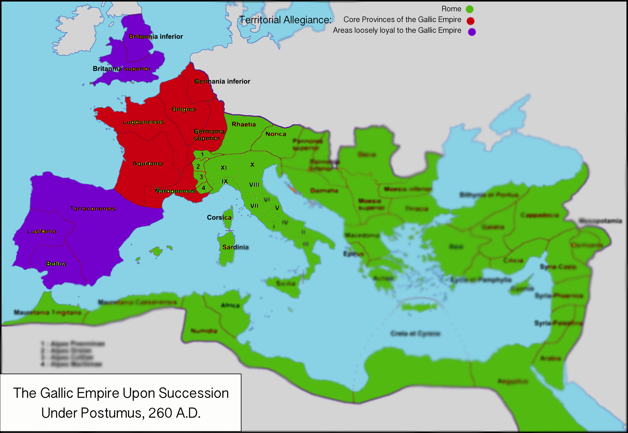 260년, 로마 제국의 장군이었던 마르쿠스 카시우스 라티니우스 포스투무스는 스스로 로마 황제를 칭호를 칭하다하고, 제국 속주인 갈리아(갈리아 아퀴타니아, 갈리아 벨기카 등), 게르마니아, 브리타니아, 히스파니아(타르라코넨시스, 그리고 남쪽의 평화로운 히스파니아 바에티카) 등을 지배 영토로 하여 사실상 독립 국가를 건설했다. 이 나라는 274년까지 4대에 걸쳐 존속했다.