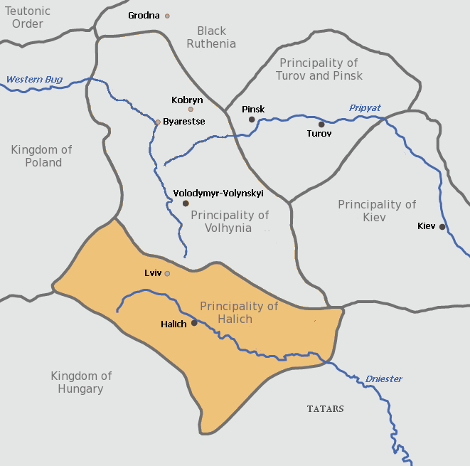 981년 블라디미르 1세가 키예프 대공국에 편입했다.[17] 12세기에 갈리치아 공국이 형성되었고, 그해 말 인접한 볼히니아 공국과 합병되어 갈리치아-볼히니아 왕국이 되었다. 갈리치아와 볼히니아는 원래 키예프 왕조의 젊은 구성원에게 교대로 할당된 두 개의 분리된 루리크 왕조 공국이었다. 볼로디미르의 로만 대공 계통은 볼히니아 공국을 소유했고, 야로슬라프 오스모미슬 계통은 갈리치아 공국을 소유했다.갈리치아-볼히니아는 1198년[18] 또는 1199년 (그리고 부계 혈통에 후계자가 없었던) 갈리치아의 마지막 공작 블라디미르 2세 야로슬라비치의 사망 이후에 생성되었다. 로만은 갈리치아 공국을 획득하고 자신의 영토를 하나의 국가로 통합했다. 로만의 후계자들은 대부분 할리치(갈리치아)를 그들의 결합된 왕국의 명칭으로 사용했다. 로만의 시대에 갈리치아-볼히니아의 주요 도시는 할리치와 볼로디미르였다. 1204년, 로만은 폴란드와 동맹하여 키예프를 점령하고, 헝가리 왕국과 평화 조약을 체결했으며, 비잔틴 제국과 외교 관계를 수립했다.[19]