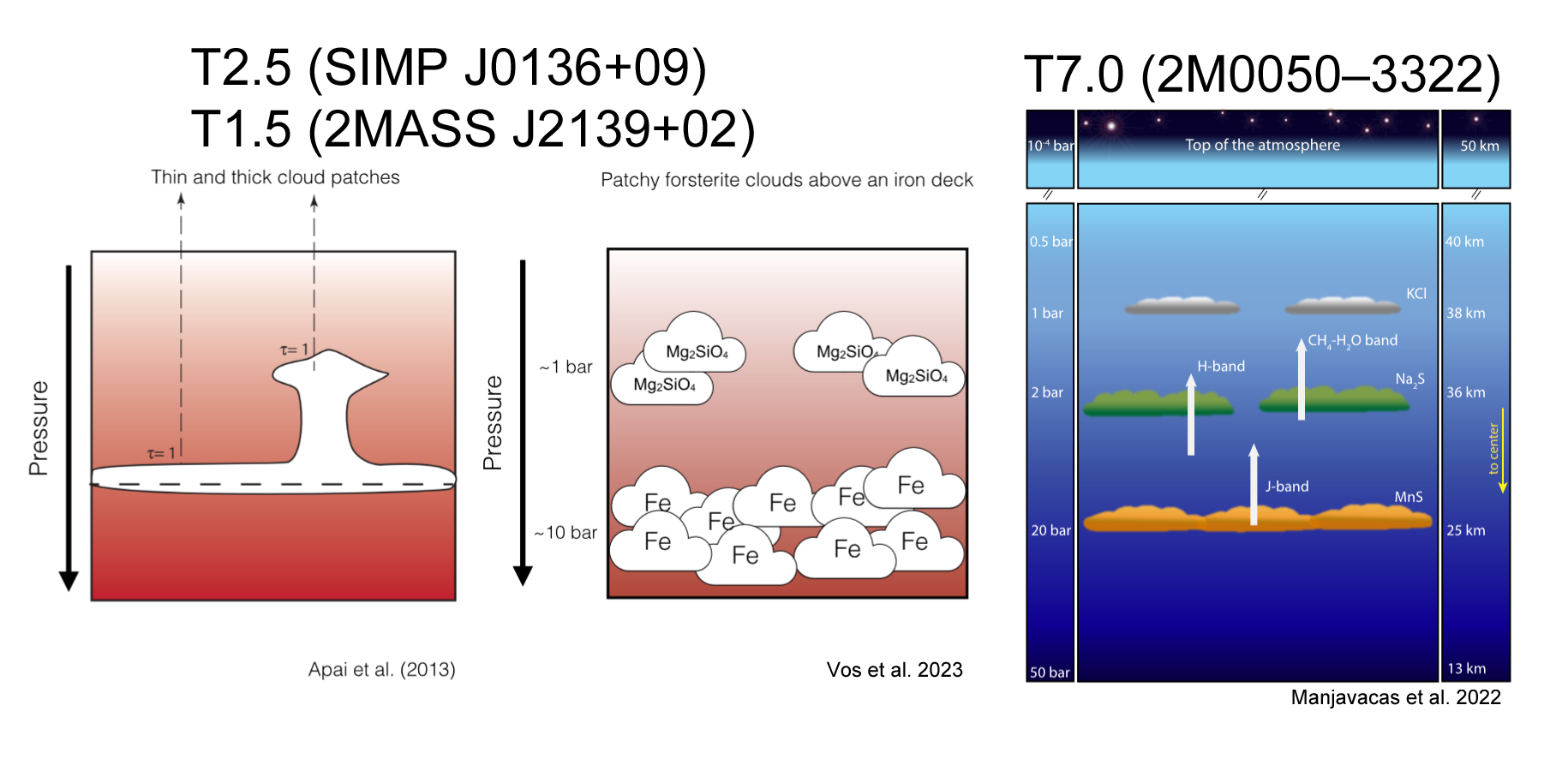 후기 L형 갈색왜성에서는 철 수소화물(FeH) 스펙트럼 선이 약화되는데, 이는 철 구름이 상층 대기에서 FeH를 고갈시키고 하층 대기의 시야를 차단하기 때문이다. 중기~후기 T형 갈색왜성의 더 차가운 온도에서는 불안정한 구름이 형성되어 FeH를 포함하는 대기의 더 깊은 층을 관측할 수 있게 한다.[29] 젊은 L/T형 갈색왜성(L2-T4)은 높은 변광성을 보이는데, 이는 구름, 고온점, 자기적 오로라, 열화학적 불안정성 등으로 설명된다.[30] 이 갈색왜성의 구름은 두께가 다른 철 구름 또는 아래쪽의 두꺼운 철 구름층과 위쪽의 규산염 구름층으로 설명되며, 규산염 구름층은 석영, 엔스타타이트, 강옥, 포스터라이트 등으로 구성될 수 있다.[31][32] 규산염 흡수는 8~12 μm의 중적외선에서 관측할 수 있으며, 스피처 IRS 관측 결과 L2-L8 갈색왜성에서 흔하지만 보편적이지는 않다.[34] MIRI는 행성 질량 동반 천체 VHS 1256b에서 규산염 흡수를 관측했다.[35]