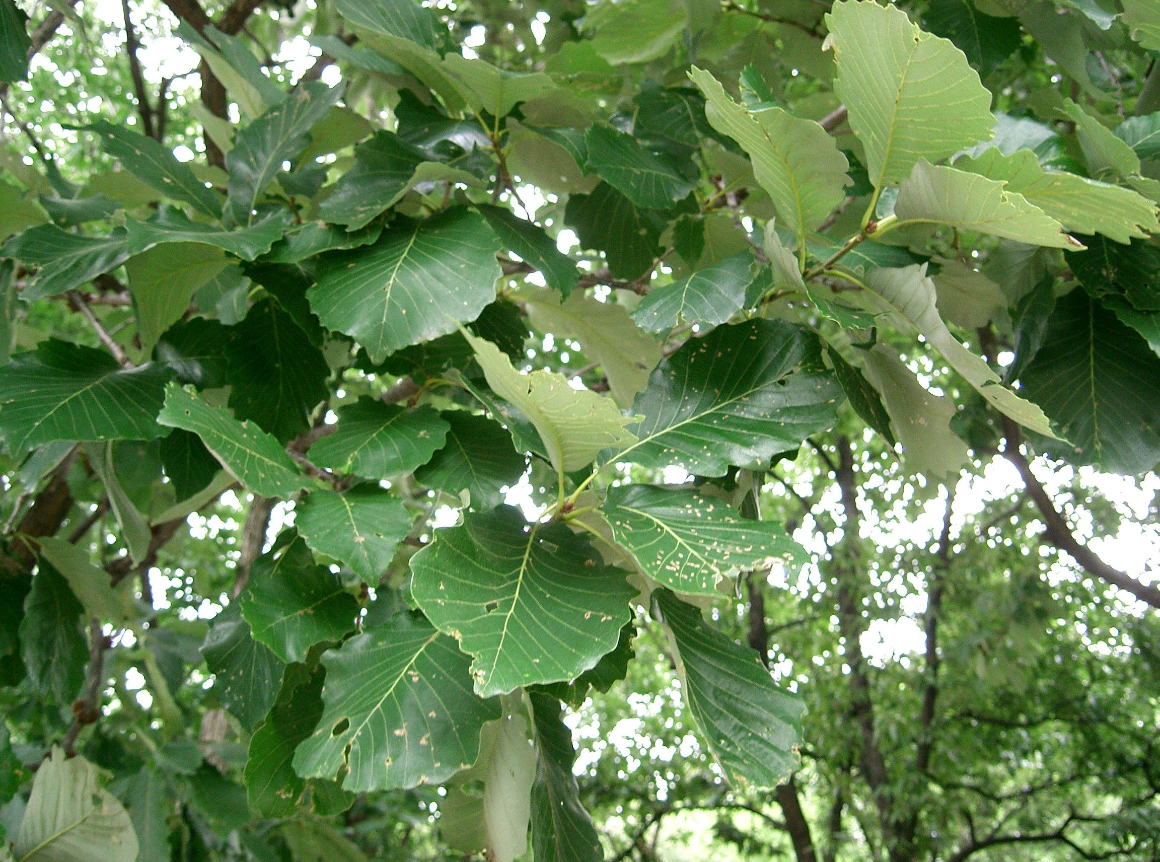 나무껍질은 세로로 얕게 갈라진다. 잎은 거꾸로 된 달걀 모양이며 아래쪽이 약간 일그러져 있고, 잎 가장자리에 물결 모양 톱니가 있다. 잎 윗면은 매끄럽고 아랫면은 매끄럽거나 빽빽한 회백색 털로 덮여 있다.