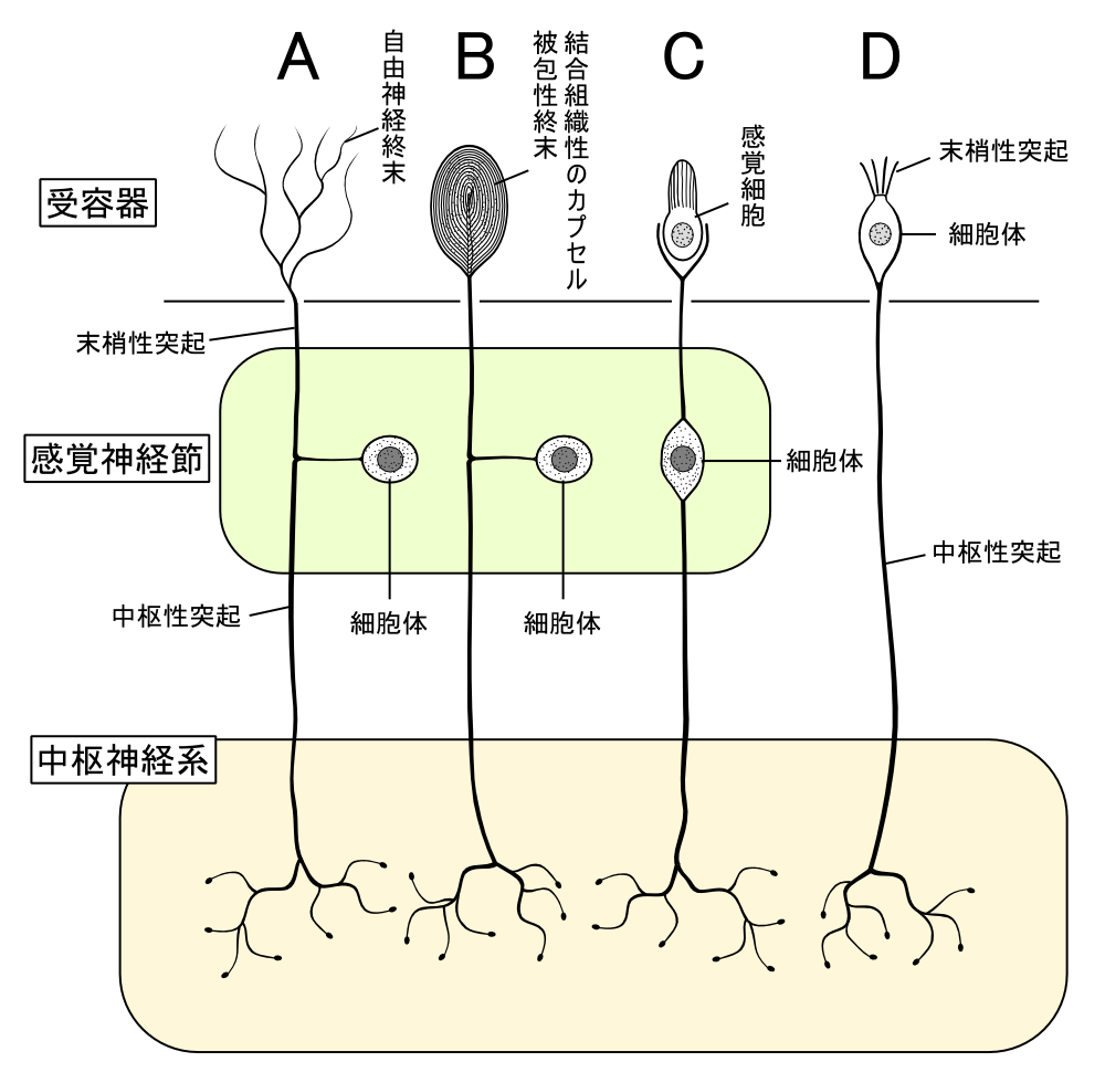 외부 수용기는 신체 외부의 자극을 받아들여 전기 신호로 변환하는 감각 신경이다. 냄새, 소리, 빛, 촉각 등을 인지한다.[4] 외부 수용기에는 화학 수용체(후각 수용기, 미뢰), 광수용체(시각), 온도 수용체(온도 감각), 통각 수용체(통증), 털 세포(청각 및 균형 감각), 촉각 및 고유 수용성 감각 (신장, 왜곡 및 스트레스)을 감지하는 다양한 다른 기계 수용체 등이 있다.[4] 척추동물의 감각 신경 세포는 주로 가짜단극신경 세포 또는 양극성 신경 세포이며, 다양한 유형의 감각 신경 세포는 서로 다른 종류의 자극에 반응하는 서로 다른 감각 수용체를 가진다.2. 1. 1. 후각