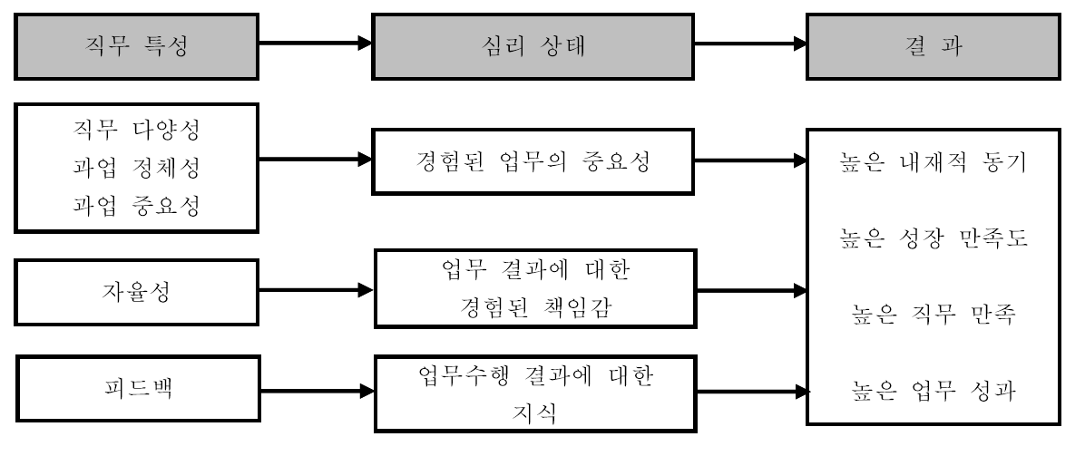 Hackman & J, R. & Oldham(1976)의 직무특성이론은 구성원의 동기나 직무만족에 대한 영향을 미치는 요인으로 '''직무특성'''을 설명한다. 이때 직무는 직무 다양성, 과업 정체성, 과업 중요성, 자율성, 피드백 총 5가지의 중요한 직무특성을 갖는다. 직무특성이론에 의하면 직무특성과 심리 상태, 그리고 결과변수가 존재한다. 직무특성에서 직무 다양성과 과업 정체성, 과업 중요도는 경험된 업무의 중요성을, 자율성은 업무 결과에 대한 경험된 책임감을, 그리고 피드백은 업무수행 결과에 따른 지식을 갖게 한다. 심리 상태는 이렇게 총 세 가지로 구분되는데 이 심리상태는 결과변수로서 높은 내제적 동기, 높은 성장 만족도, 높은 직무 만족, 높은 업무 성과에 영향을 준다.[80]