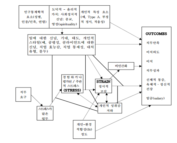 Koeske(1993)의 과정모델(SSO : Stress-Strain-Outcome Model)을 바탕으로 직무 스트레스 유발 요인(사건의 발생)-스트레스(스트레스에 대한 지각)-긴장(감정 소진)-성과(직무 불만족)를 경로 분석한 결과, 역할 갈등은 소진에 직접적이고 밀접한 영향을 미치며, 동시에 직무 불만족의 원인으로 소진이 작용함을 알 수 있었다.[88][89]